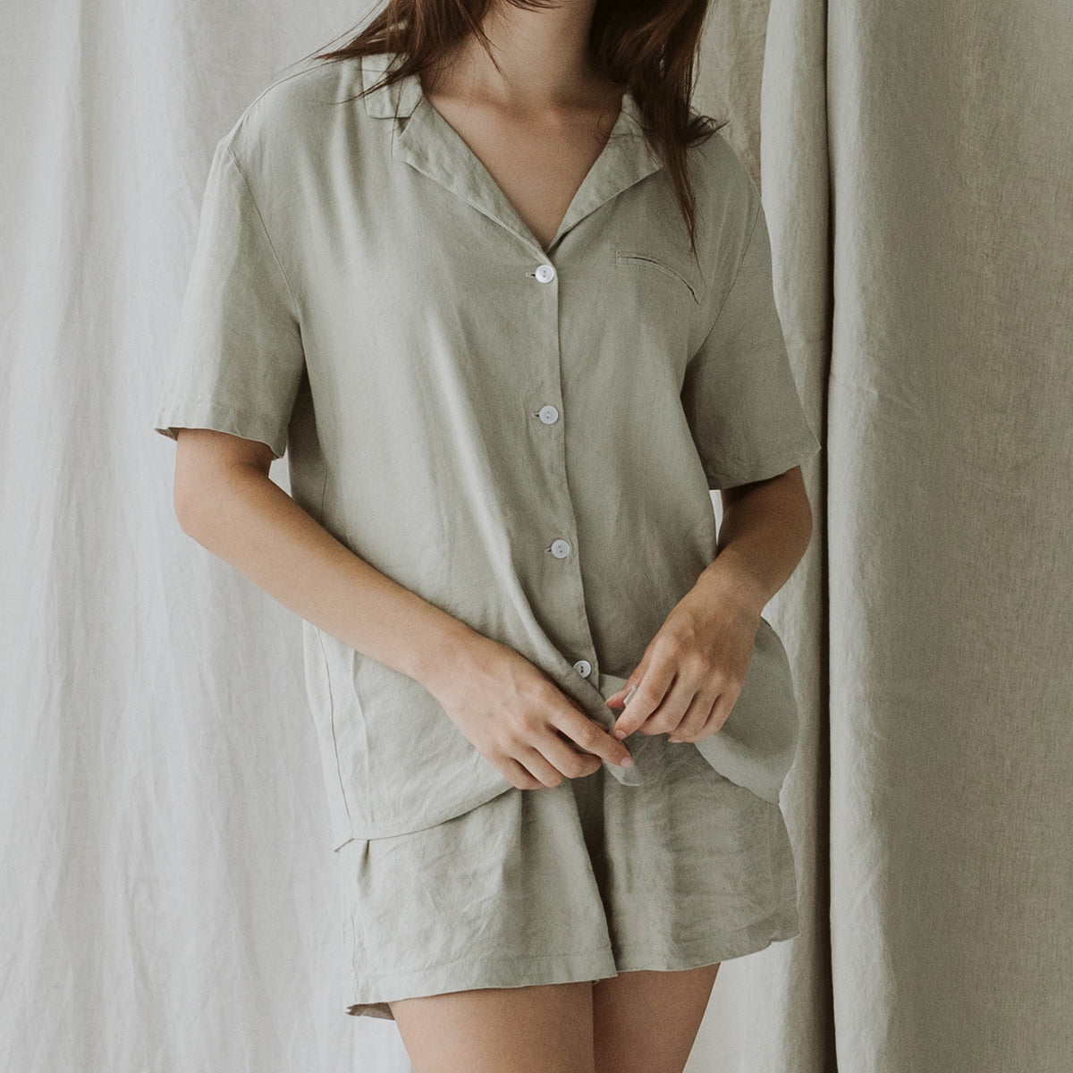 Our solid colored sleepwear collection is made from our heirloom linen blended with bamboo derived rayon for extra drape and softness. Offered in some of our favorite earth tones, the Mila Short Sleeve top has a relaxed fit and is inspired by vintage pajamas.