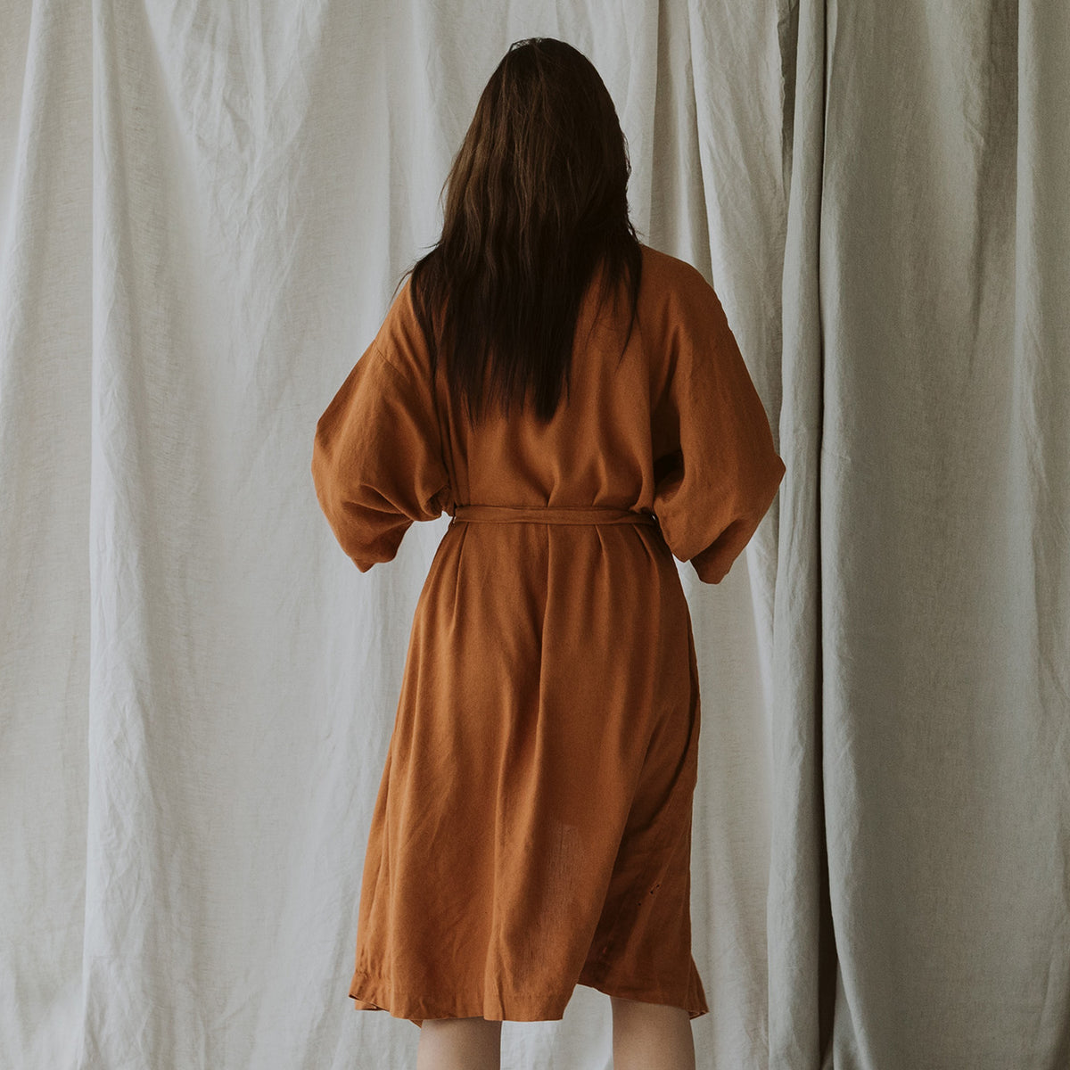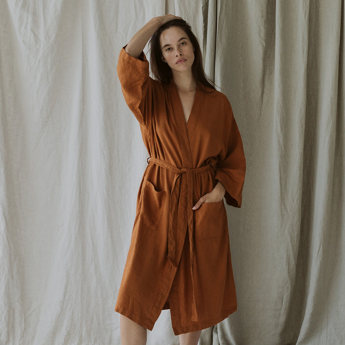 Our solid colored sleepwear collection is made from our heirloom linen blended with bamboo derived rayon for extra drape and softness. The Nola Robe is a mid length robe with loose ¾ length sleeves, a self tie, pockets, and an oversized fit. It’s the perfect lightweight piece to throw on over your pajamas, after a shower, or anytime you want to lounge.